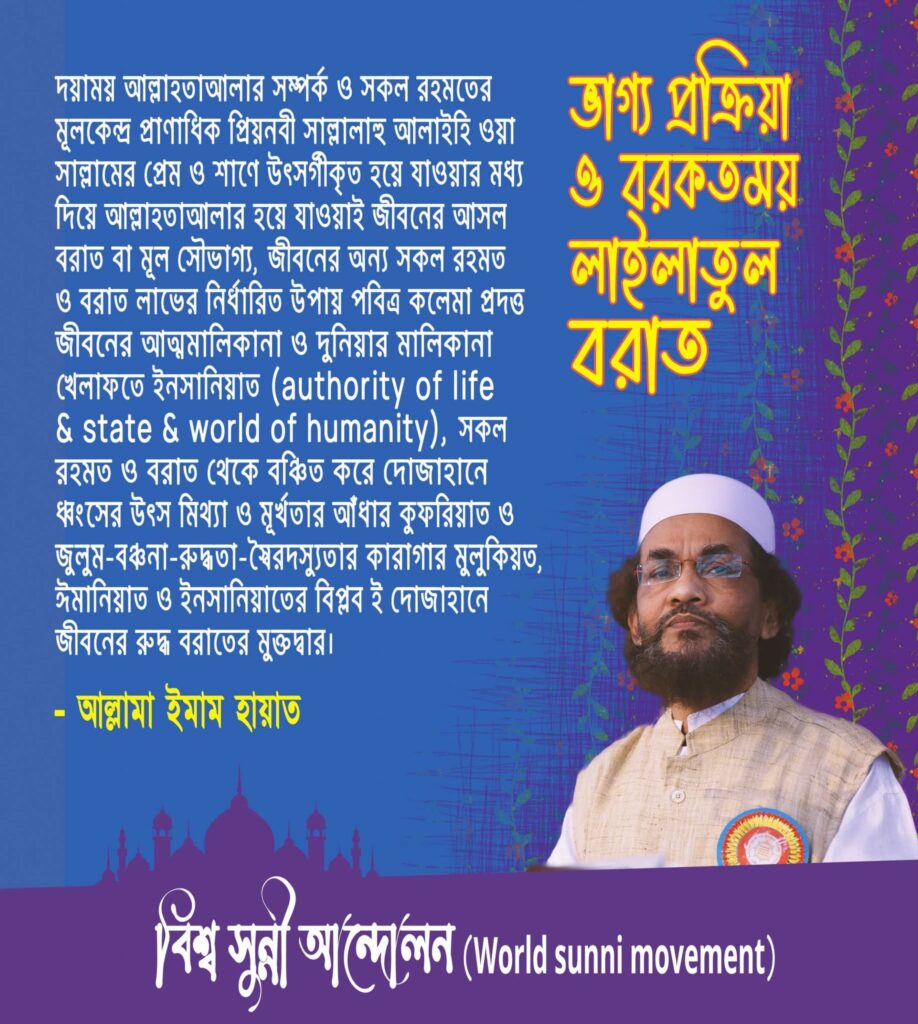 দয়াময় আল্লাহতাআলার সম্পর্ক ও সকল রহমতের মূলকেন্দ্র প্রাণাধিক প্রিয়নবী সাল্লাাহু আলাইহি ওয়া সাল্লামের প্রেম ও শাণে উৎসর্গীকৃত হয়ে যাওয়ার মধ্য দিয়ে আল্লাহতাআলার হয়ে যাওয়াই জীবনের আসল বরাত বা মূল সৌভাগ্য, জীবনের অন্য সকল রহমত ও বরাত লাভের নির্ধারিত উপায় পবিত্র কলেমা প্রদত্ত জীবনের আত্মমালিকানা ও দুনিয়ার মালিকানা খেলাফতে ইনসানিয়াত (politics for authority of life and state and world of universal humanity; given by beloved holy Rasul, the source of all blessing-love-humanity), সকল রহমত ও বরাত থেকে বঞ্চিত করে দোজাহানে ধ্বংসের উৎস মিথ্যা ও মূর্খতার আঁধার কুফরিয়াত ও জুলুম-বঞ্চনা-রুদ্ধতা- স্বৈরদস্যুতার কারাগার মুলুকিয়ত, ঈমানিয়াত ও ইনসানিয়াতের বিপ্লব ই দোজাহানে জীবনের রুদ্ধ বরাতের মুক্তদ্বার।