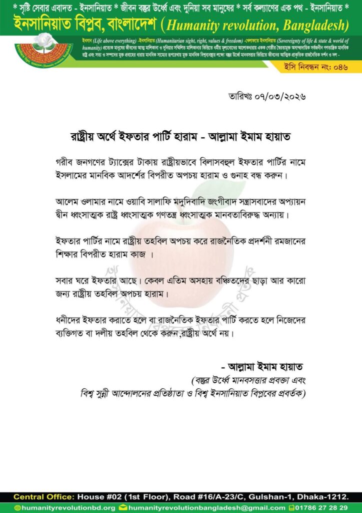 গরীব জনগণের ট্যাক্সের টাকায় রাষ্ট্রীয়ভাবে বিলাসবহুল ইফতার পার্টির নামে ইসলামের মানবিক আদর্শের অপচয় হারাম ও গুনাহ বন্ধ করুন।